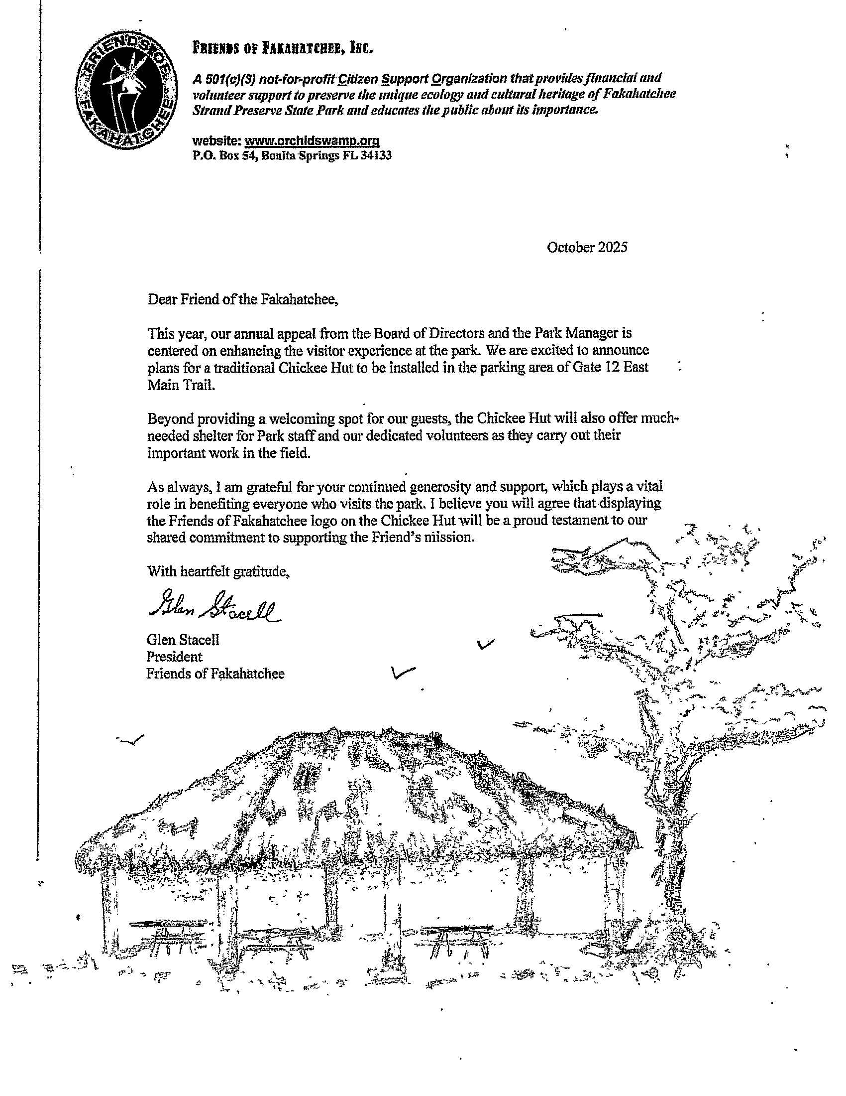 Friends of Fakahatchee (FOF) welcomes the opportunity to work with donors and their advisors for planned giving objectives, FOF is grateful for gifts of publicly trades securities; Qualified Charitable Distributions (QCD’s) from Individual Retirement Accounts; testamentary bequests from the estate plans of our supporters.